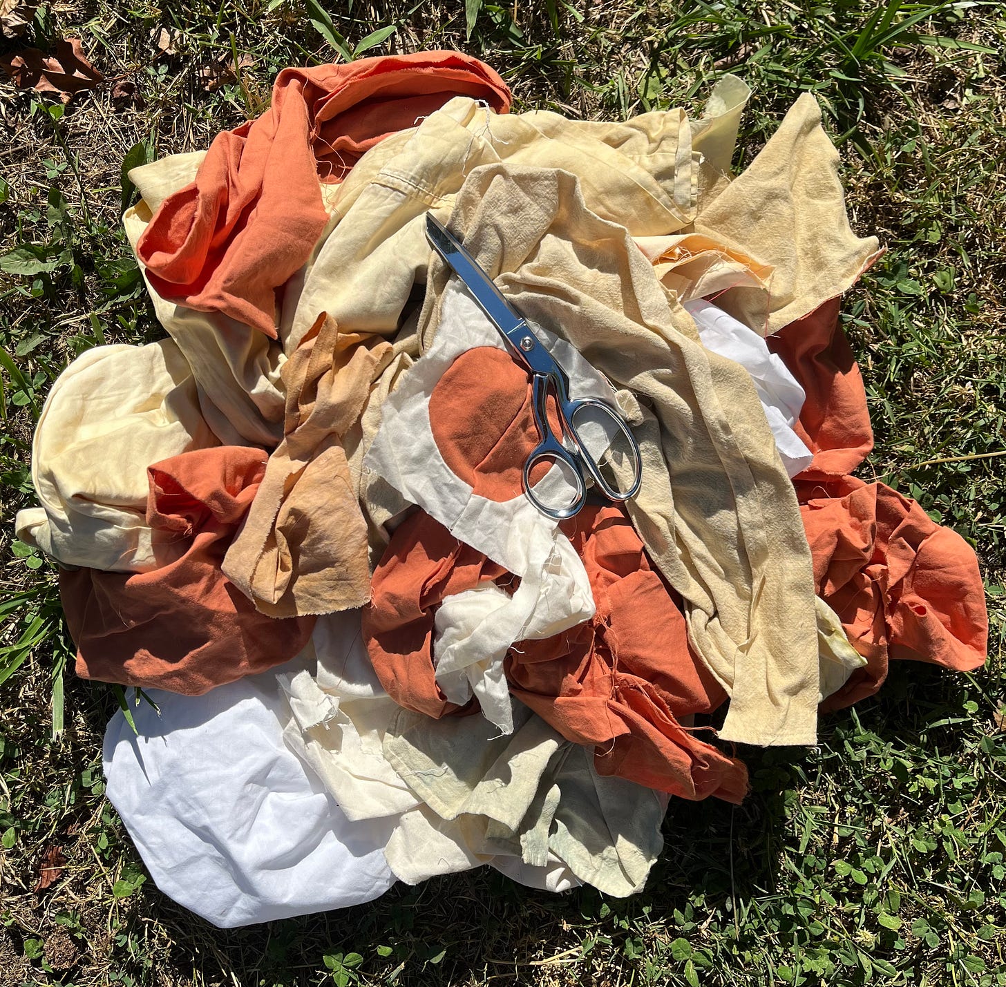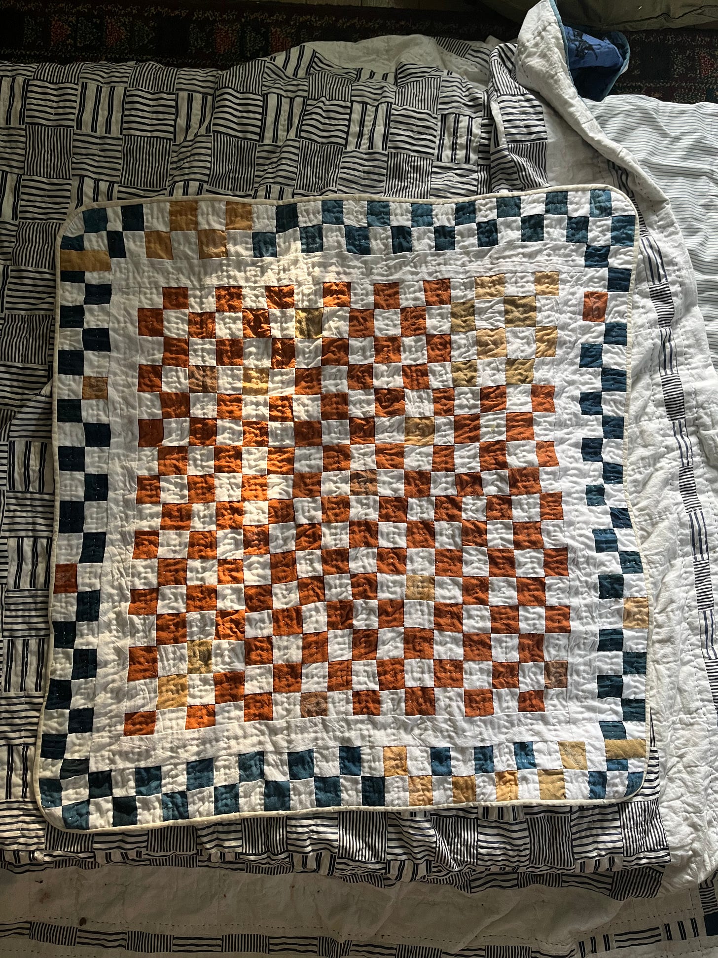 I want to see work that indicates labor by honoring its material components. On a non-museum scale, I am making a variety of quilts to be sent to homes of lovely people. When I do natural dye vats, I tend to dye small amounts of fabric at a time to get better solids and because I want to limit how much I spend on new muslin. The center of this baby quilt for a new family member is dyed with Bradford pear bark and stretched as far as the little scrap I dyed would allow. The border in its wonky whimsy would not exist had I been able to simply buy more Bradford pear bark cloth. I often feel that the material holds the spirit of the work, it tells me what it wants to be. This is something I pinched from Ann Hamilton’s material spiritualism and perhaps the best thing I was left with after working for her.
